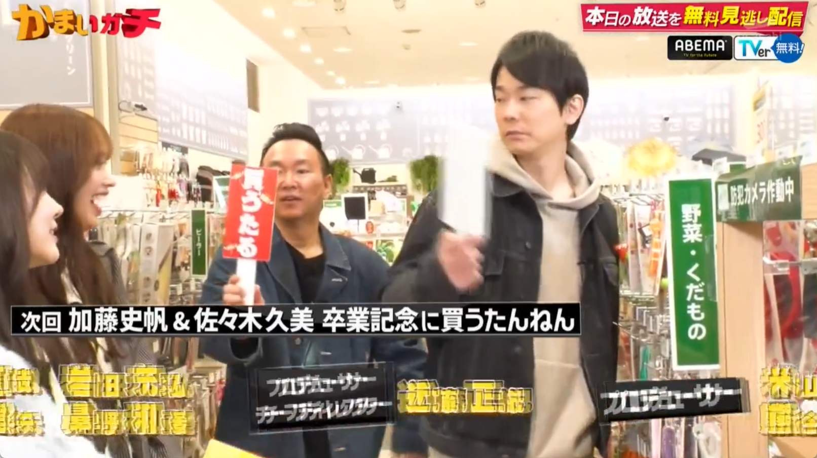 今回のかまいガチは『かとし&久美ちゃん 卒業おめでとう記念で買うたんねん!!』▼日向坂46を卒業した加藤史帆と佐々木久美に、かまいガチ初期からの感謝を込めて爆買いお祝いロケを敢行!▼舞台は大型ショッピングセンター▼2人が「本気で欲しいモノ」をリクエストし、「買うたる札」を引いた濱家か山内が、自腹でプレゼント!▼買って買って買いまくる卒業記念スペシャル!